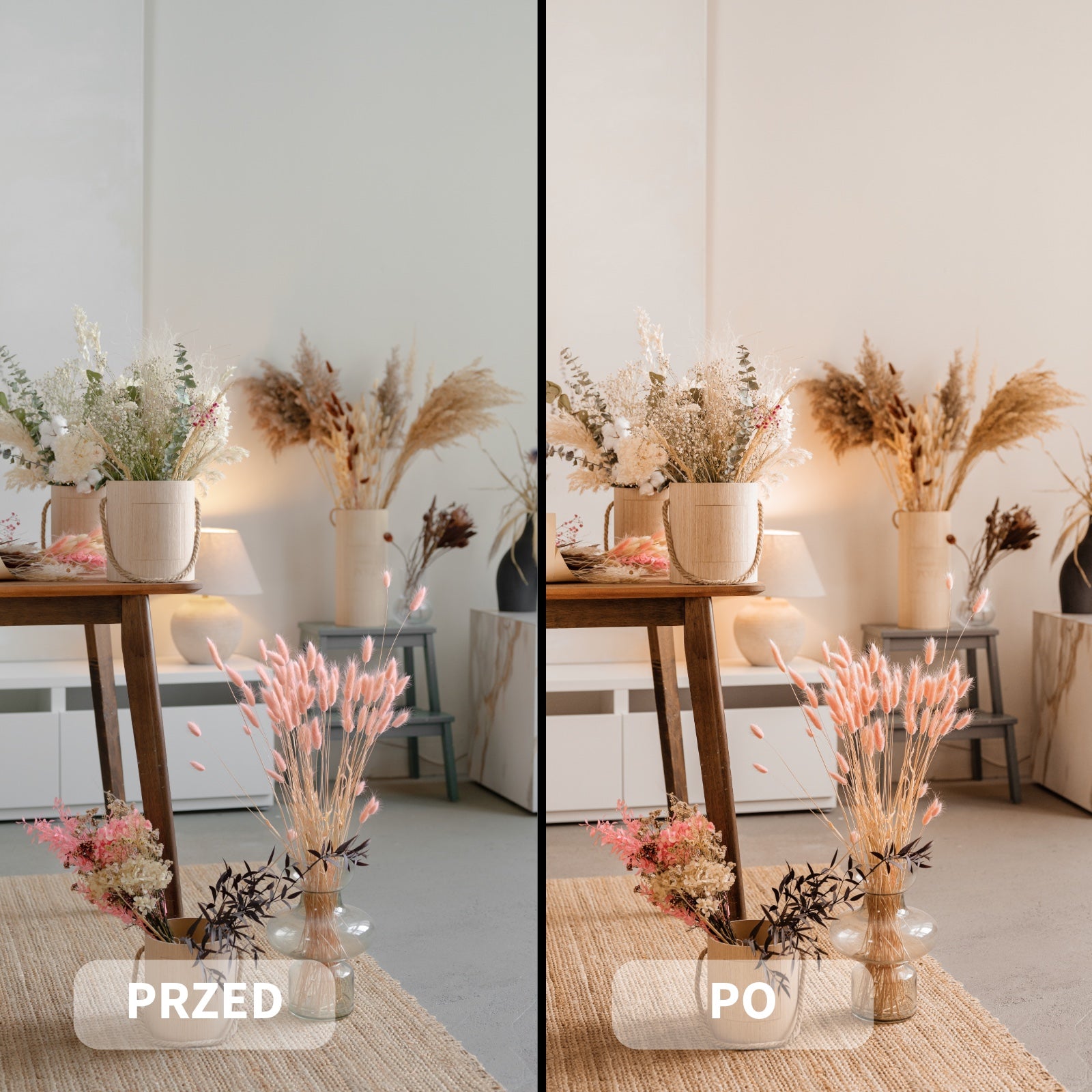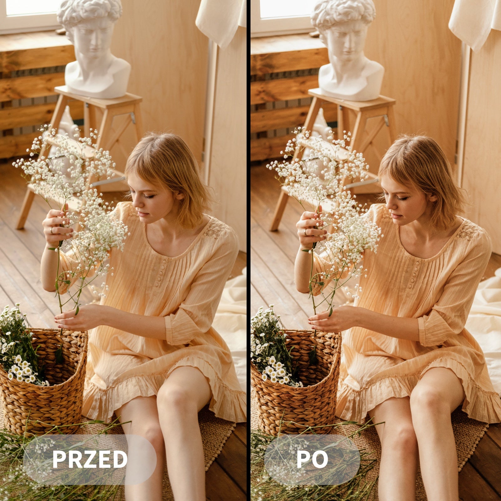 Preset Boho Dream zdůrazňuje teplé, pastelové tóny, měkké světlo a přirozené kontrasty, dodávající fotografiím útulnou, éterickou estetiku.