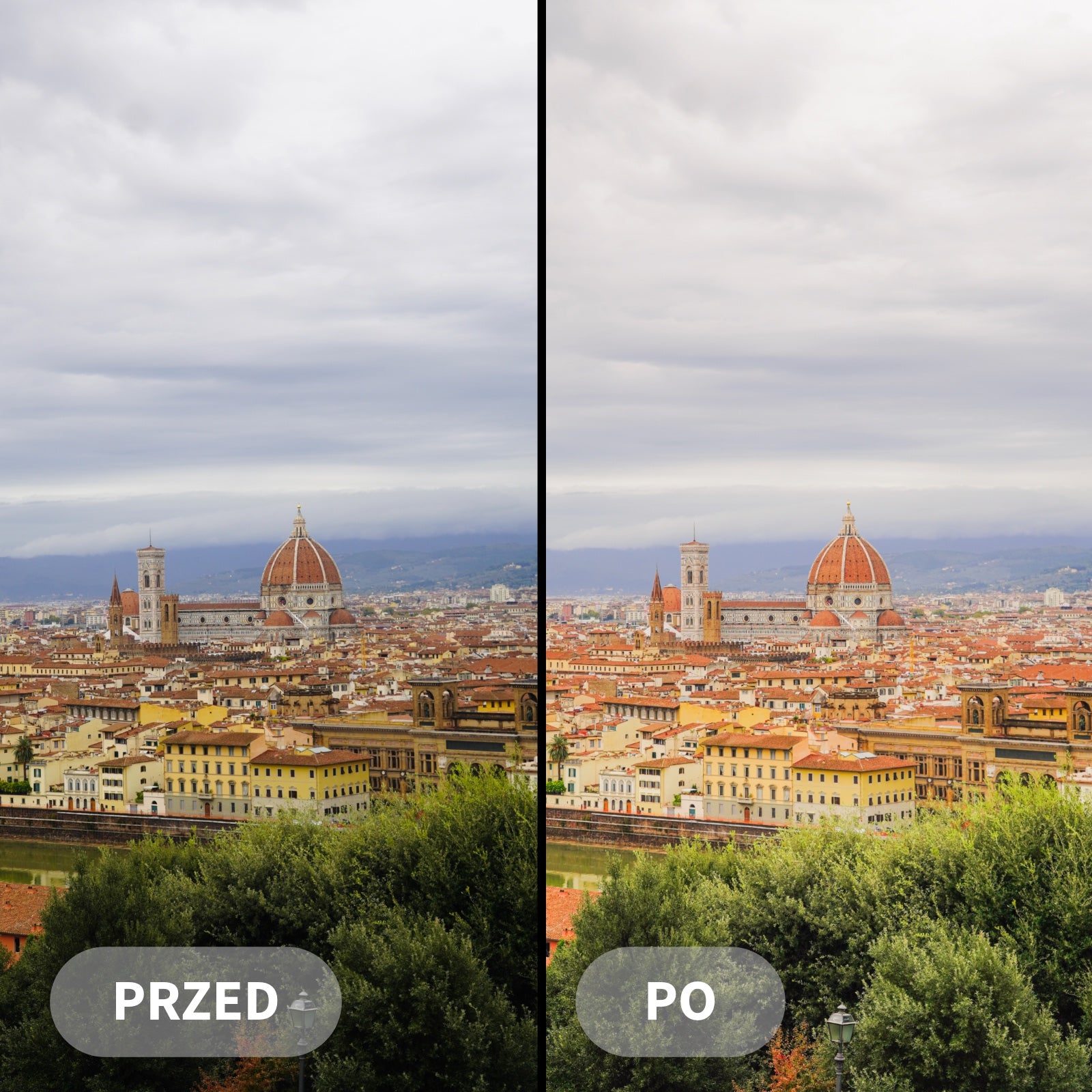 Preset Italy zvýrazňuje zlaté a teplé tóny, jemně snižuje kontrasty a dodává fotografiím měkký, romantický vzhled. Různé varianty presetů v balíčku umožňují přizpůsobit efekt plnému slunci, pastelovým západům slunce nebo jemným interiérům.
